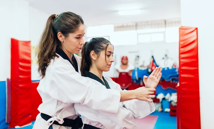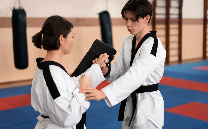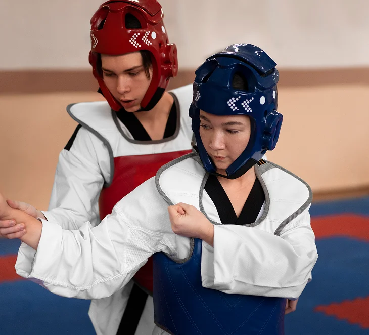 Students are introduced to basic techniques in a more structured environment. “Belt” tests at the end of the term allow students to work toward tangible goals and showcase their newfound skills! Each session of the program consists of a 30-minute class. Students will learn a more formal curriculum of basic blocks, kicks, and Taekwondo’s punches, but there is no physical contact between students. Many practice drills are conducted on kicking pads and shields. Students are taught lessons in the proper time and situations for the use of their new-found skills. A belt promotion system whereby the students will earn different color belts upon completing certain skill sets and quarterly belt promotion tests in which students earn striped belts will reinforce positive behavior and serve as incentives for improvement.